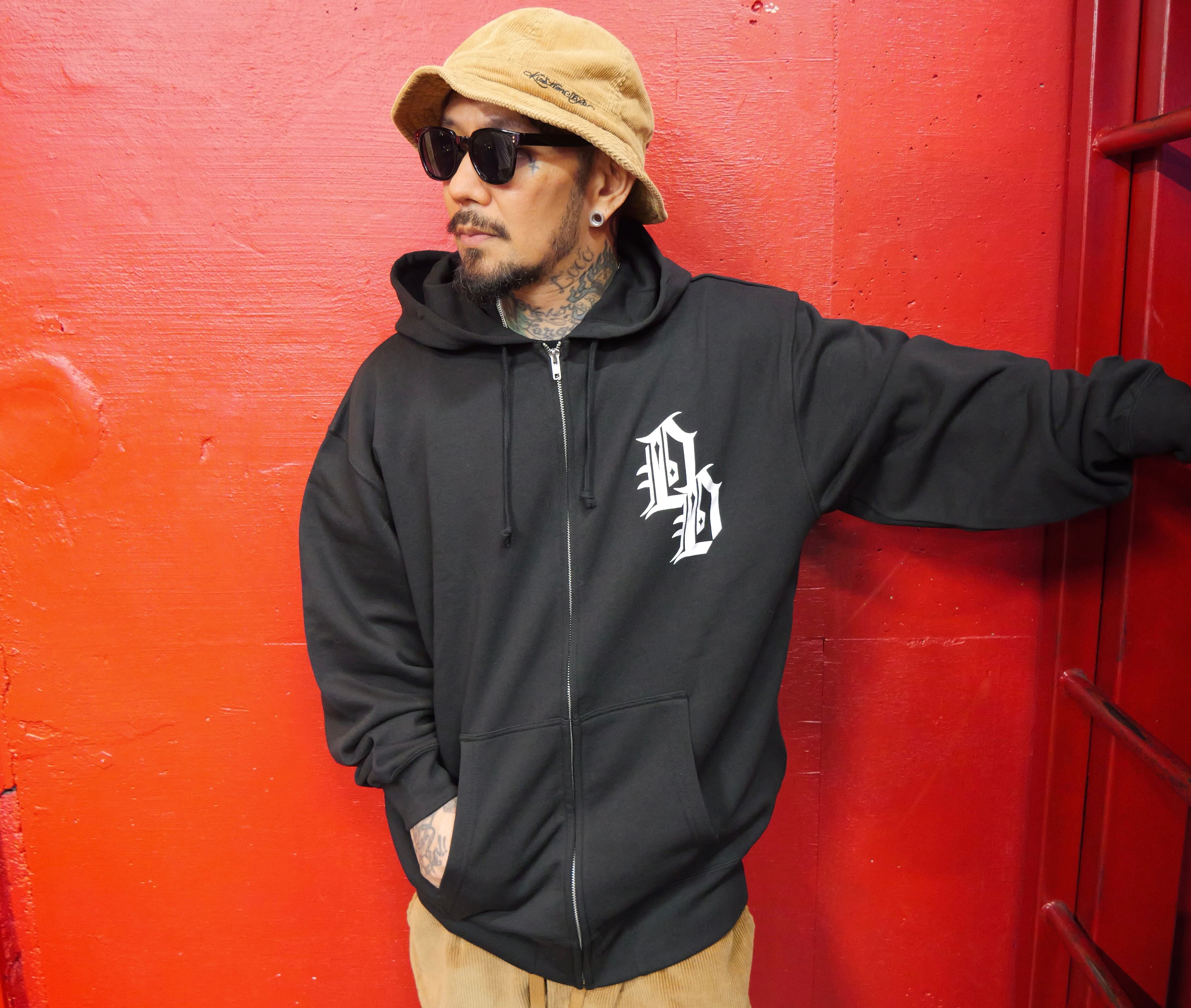 フロントとバックのDDのロゴが特徴的な、着脱が簡単で様々なスタイルに対応するスウェットフルジップパーカー。